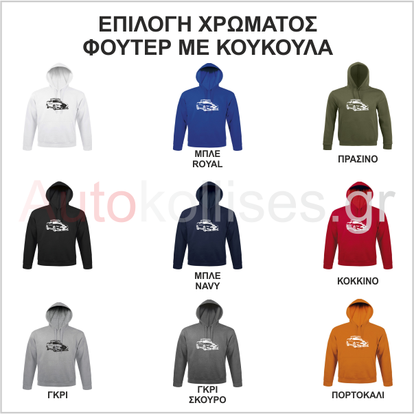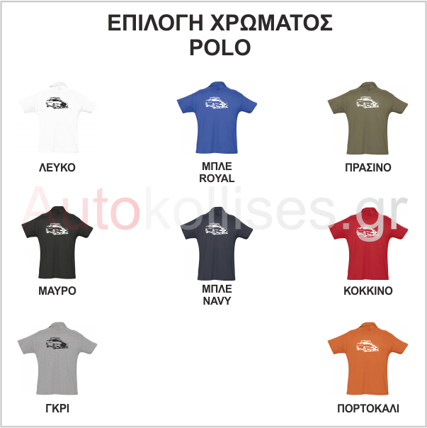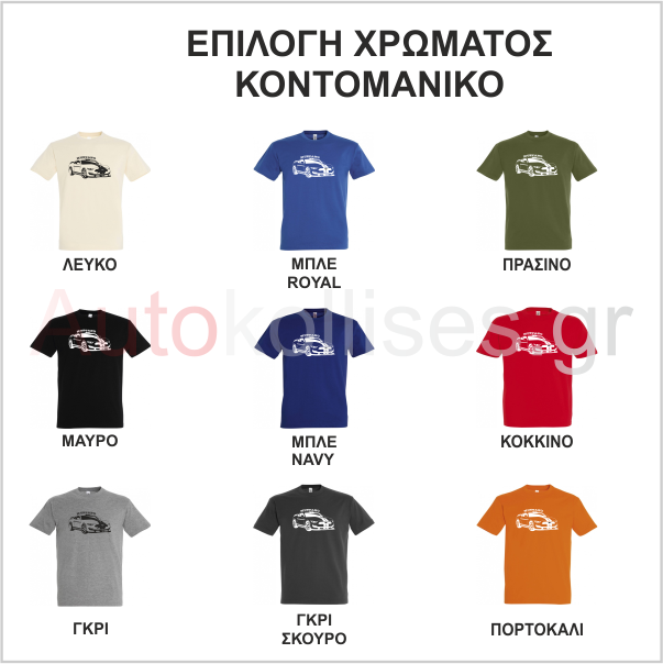 Μαύρο, Λευκό, Γκρι, Γκρι σκούρο, Μπλε royal, Μπλε navy, Κόκκινο, Πορτοκαλί, Πράσινο